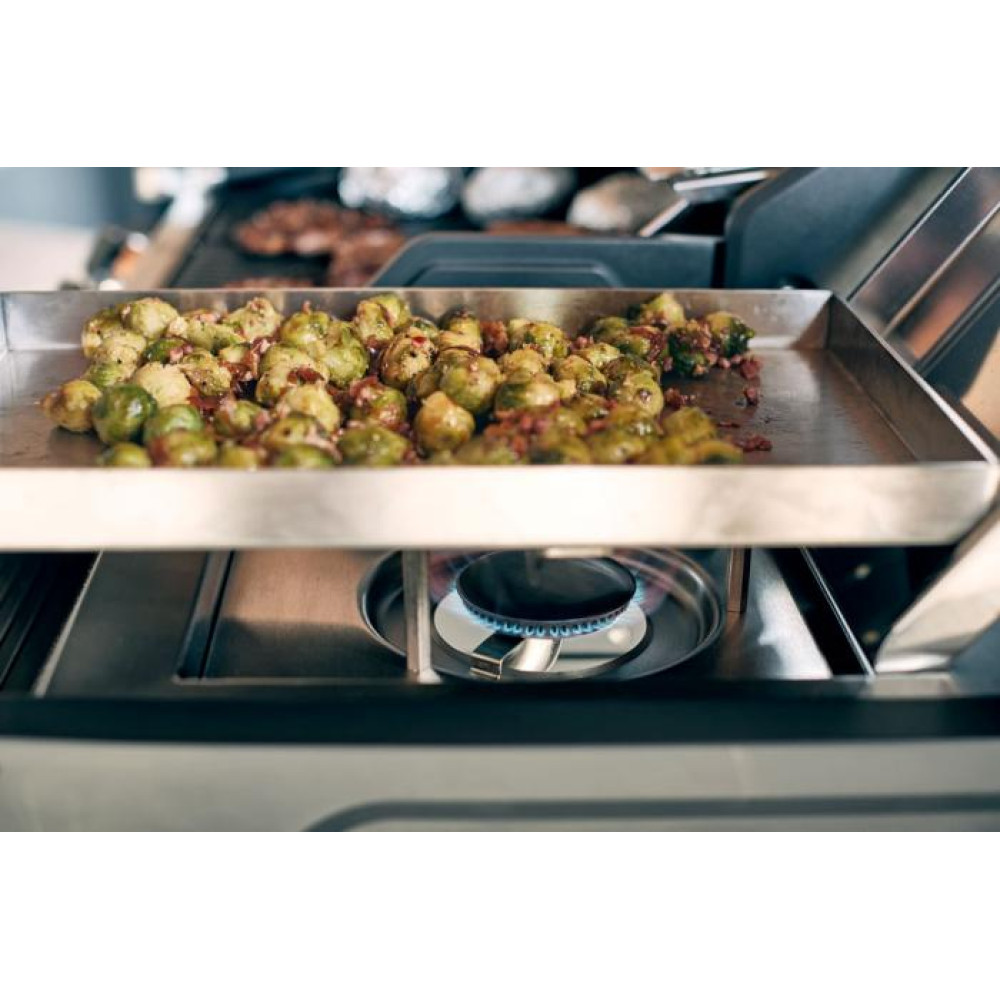 Масивний лист із спеціальної полірованої нержавіючої сталі для швидкого приготування соковитих і корисних страв. Тепер у Вас є можливість готувати на грилі все що не могли готувати на решітках чи то яєчня, бекон чи овочеве рагу! Це чудовий спосіб ефективно використати бічну конфорку вашого газового гриля. Завдяки піднятим краям сковороди для гриля з нержавіючої сталі ви можете легко працювати лопаткою, нічого не втрачаючи при цьому на грилі. Застосовується в грилях Monroe Pro 3+4 та Boston 3+4