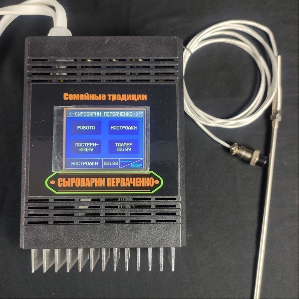 У комплекті автоматичної сироварні 50 л. іде контролер-автоматика з сенсорним екраном. Дана автоматика неймовірно проста у використанні і дозволить вам легко і швидко управляти і контролювати всіма процесами варіння сиру. Завдяки електроклапанів, який йде в комплекті, контролер має функцію автоматичної пастеризації та охолодження молока. Досить вибрати потрібну функцію і вбудований таймер сповістить Вас про закінчення часу того чи іншого процесу. Новий датчик температури з платиновим елементом РТ100 дозволить Вам підтримувати температуру в сироробний ванні з точністю до 0,1 при цьому контролер під управлінням мікропроцесора СТМ3000, який працює по протоколу ПІД регулювання дозволить підтримувати задану температуру в сироварні, без інерції.
