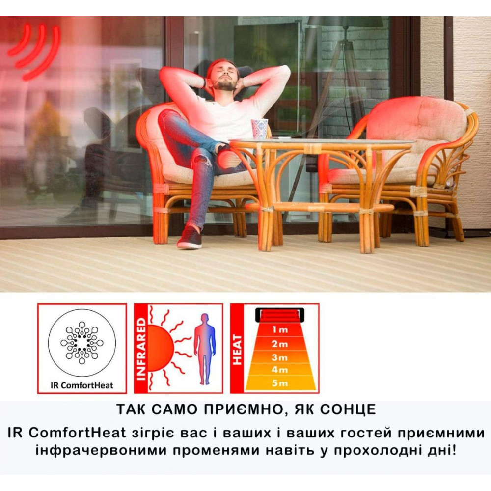 - Карбоновий нагрівальний елемент генерує інфрачервоне випромінювання, яке нагріває не повітря, а предмети та людей, що перебувають у радіусі дії.