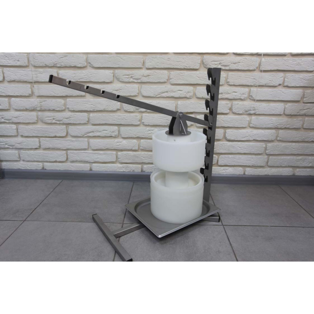 Прес для пресування головок сиру має зручний важіль, на який можна підвішувати або надягати вантаж, призначений для пресування. Пересуваючи вантаж по важелю, Ви можете змінювати тиск від 1 до 3 величин ваги. Таким чином вантаж 1 кг., Підвішений у підстави важеля буде створювати тиск 1 кг, при цьому, якщо перемістити вантаж на довге плече важеля, тиск зросте до 3 кг.