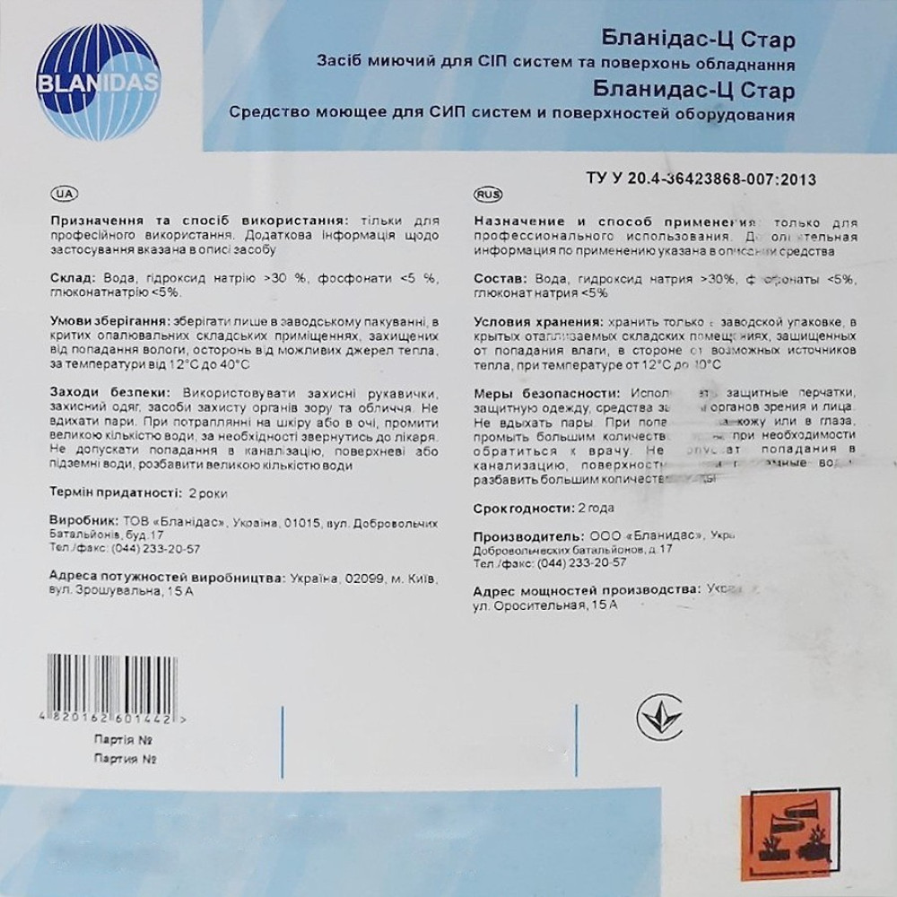 Бланидас-Ц Стар – это сверхмощный, слабопенный, жидкий каустический детергент, который подходит для воды любой жесткости и применяется в СИП системах, бутыломоечных машинах и других системах мойки. Высокоэффективное средство для удаления широкого спектра органических загрязнений, что предотвращает появление налета.