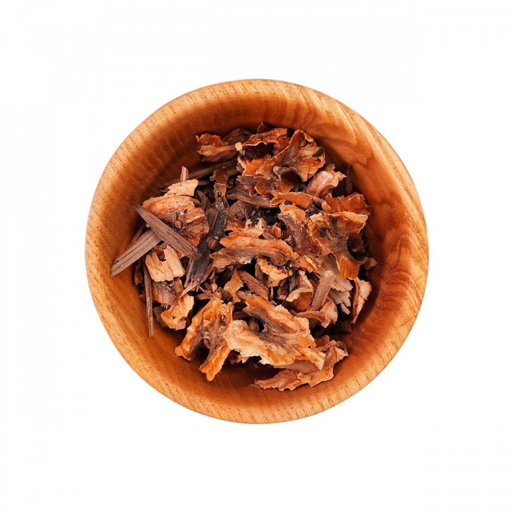 Треска дубовая обжаренная, орех грецкий (перегородки), тмин, чай черный, ванилин, гвоздика
