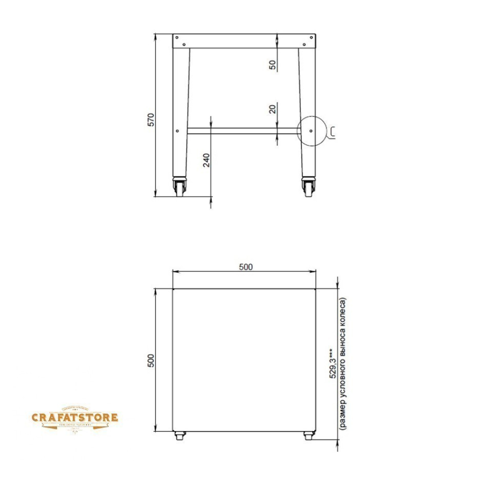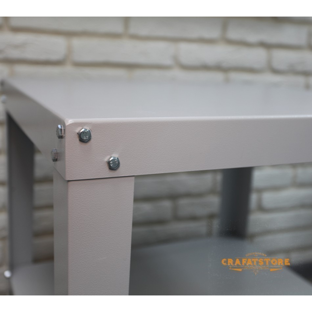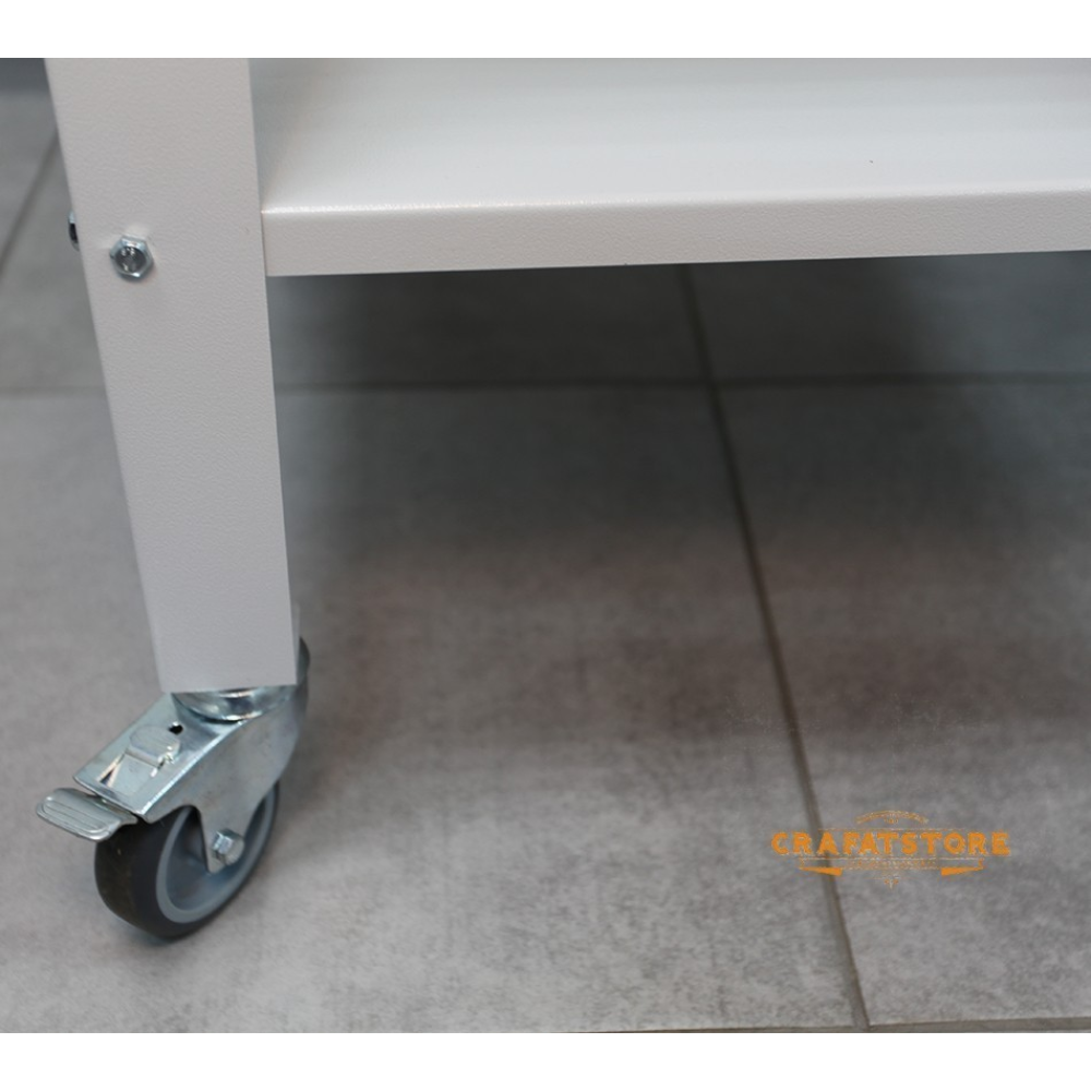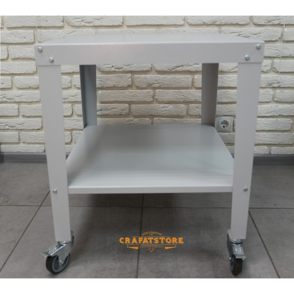 Стол выполнен из листовой стали и покрыт порошковой эмалью. Так же имеет разборную конструкцию и четыре колесика, благодаря чему его можно легко передвигать. Два колеса имеют тормоз.